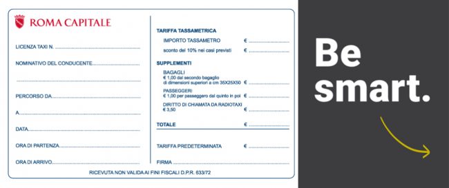 - Ricevute: Il messaggio viene applicato sul lato esterno delle ricevute cartacee che il tassista consegna al cliente a fine corsa. Soluzione efficace poichè la ricevuta rimane in mano al cliente una volta sceso dal taxi e, di norma viene conservata o consegnata agli uffici amministrativi.
