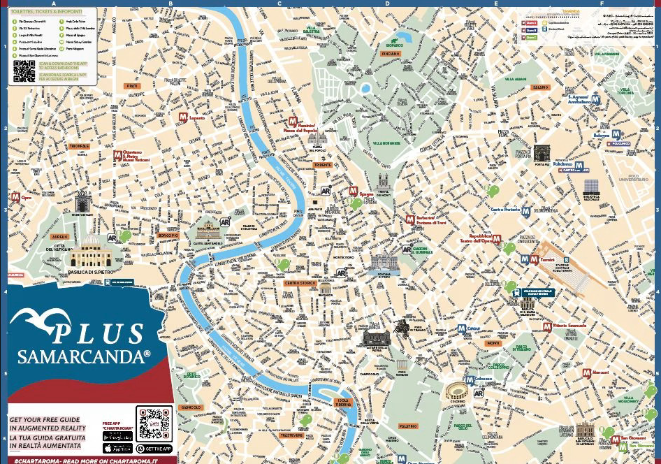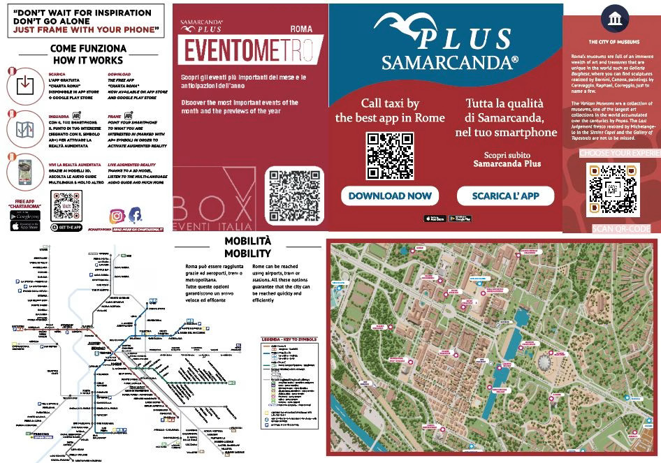 - Mappe turistiche: mappe distribuite a bordo taxi e nei principali hotel del centro (da 4 stelle in su). Al loro interno la posizione dei p.stop, una guida in realtà aumentata disponibile in inglese, francese, spagnolo e italiano, e tutti gli eventi a Roma.