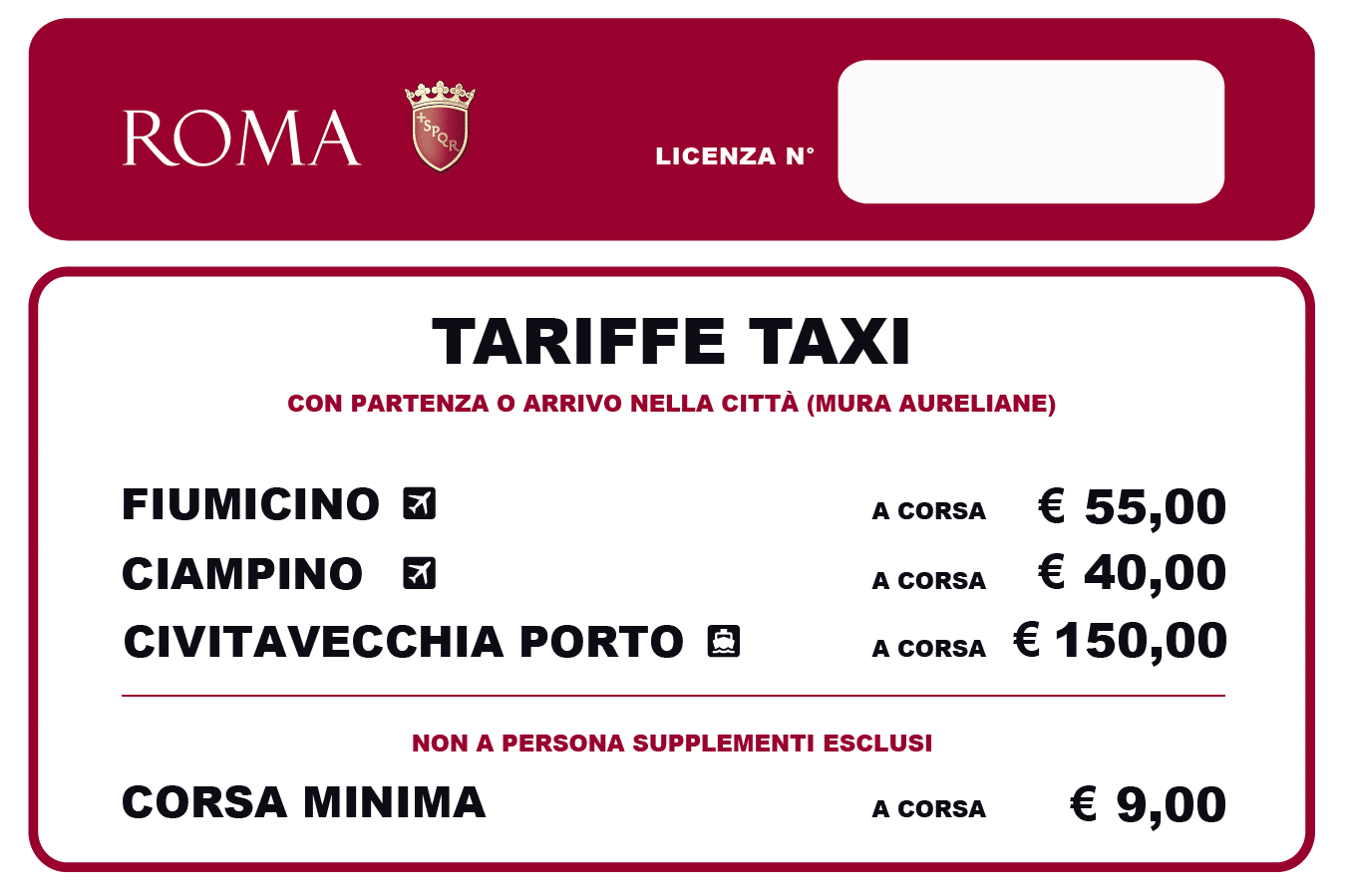 Samarcanda aderisce ai prezzi concordati dal comune di Roma per la tratte dalle Mura Aureliane fino a Fiumicino aeroporto (e viceversa) con il prezzo unico a 55€.